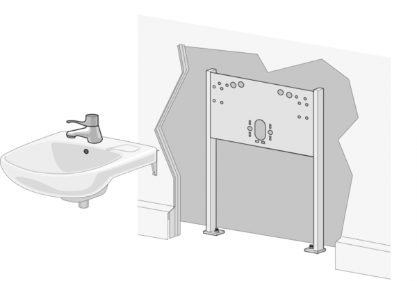 Tvättställsfixtur tillverkad av bockad plåt och stålprofil med håltagning för vatten- och avloppsanslutning.